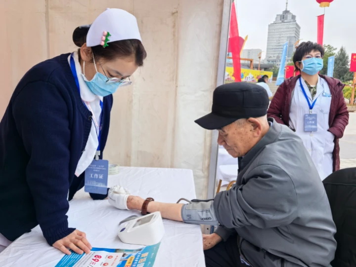 启动仪式现场,医护人员为老人测量血压。