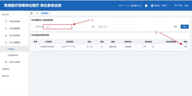登录“单位网厅”→“点击网上经办”→“职工待遇管理”→“生育登记”,第一步:输入证件号码点击查询;第二步:点击【申报】按钮,填写生育登记信息,并上传相关材料后提交。