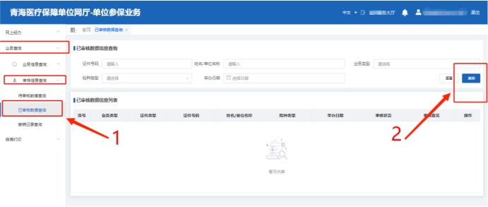 可在已审核信息中查询已审核通过、审核不通过状态及原因。业务查询→审核信息→已审核信息,在业务类型中选择对应业务类型点击查询。