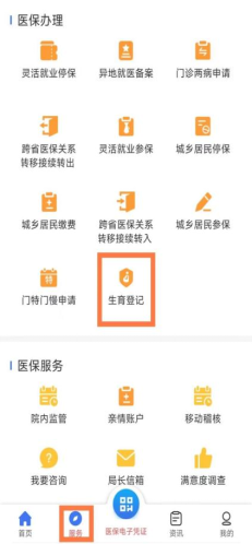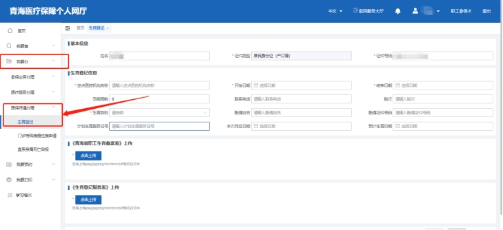 登录“青海医保APP”→“服务”→“医保办理”→“生育登记”,填写生育登记信息,并上传相关材料后提交。