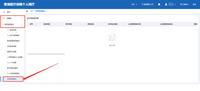 点击我要查→参保信息查询→生育信息查询,对个人生育备案信息的查询。