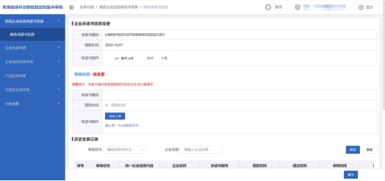 进入后点击左侧菜单列表上选择【医药企业信用承诺书变更】进入医药企业信用承诺书变更申请页面按照要求填写对应资质信息,点击“提交”按钮完成用户的变更提交操作,后续等待管理端进行审核即可,如审核不通过修改后重新提交,等待审核即可。