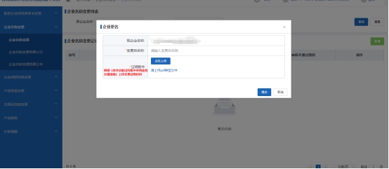 点击左侧菜单列表上选择【企业名称变更】进入企业名称变更菜单栏,点击菜单【企业名称变更】进入企业名称变更列表(如图4),点击“新增”按钮进行企业名称变更申请操作,在当前弹窗页面填写变更后企业名称及上传证明文件,确认无误后进行提交即可(如图5),后续等待管理端进行审核即可,如审核不通过在菜单操作项中点击编辑进行修改后重新提交(如图6),等待审核即可。审核通过后会进行公示、公布,企业可关注【企业名称变更信息公示】【企业名称变更信息公布】(如图7)