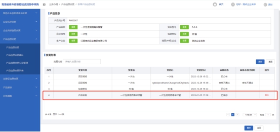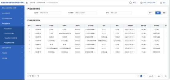1、点击左侧菜单列表上选择【产品信息变更】进入产品信息变更菜单栏,点击菜单【产品信息变更】进入产品信息变更列表(如图12),点击操作项中【产品信息变更】按钮进入产品信息变更页面(如图13),在当前页面可根据可变更项点击每一项后面【变更】按钮填写变更后企业名称及上传证明文件,确认无误后进行保存(如图14),保存后可在下发变更列表中查询到刚才进行保存的变更信息和审核状态,保存状态可删除。(如图15)。在当前页面可对保存资质变更信息进行提交,提交后等待中心端进行审核即可,可点击(图12)操作项中【查看】按钮进行查看提交数据状态(如图16)